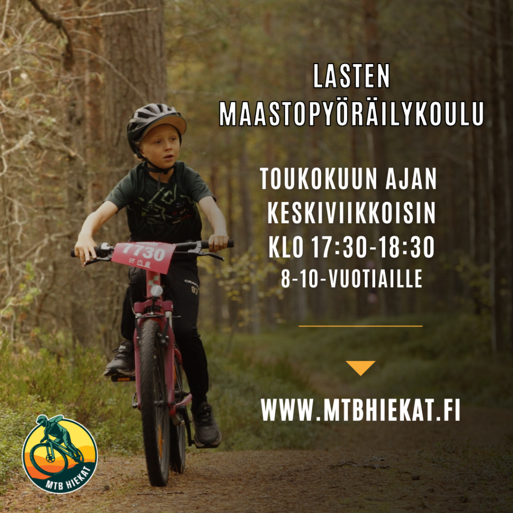 Lasten maastopyöräilykoulu toukokuun ajan keskiviikkoisin klo 17:30-18:30 , kokoontumispaikat vaihtelevat.